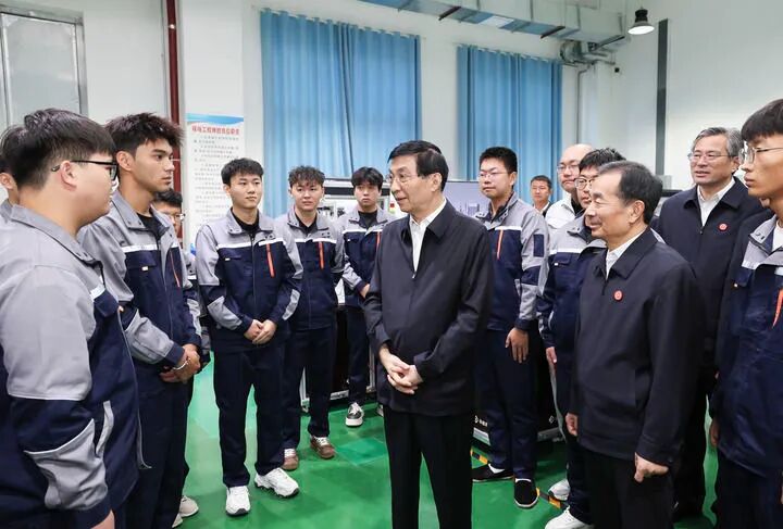 9月26日,受习近平总书记嘱托,中共中央政治局常委、全国政协主席、中央代表团团长王沪宁带领中央代表团部分成员到新疆生产建设兵团第二师铁门关市、第十师北屯市考察。这是王沪宁和中央代表团部分成员在兵团兴新职业技术学院考察职业教育发展情况。新华社记者 姚大伟摄
